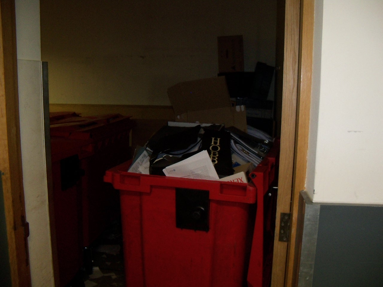 In the next picture, the door is being held open by the combustible waste that may be starting point of any fire in the premises: